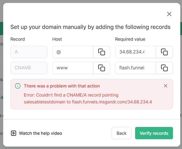 NOTE: If you see the error message “Couldn’t find a CNAME/A record pointing www to flash.funnels.msgsndr.com” then you may have something in your DNS settings input incorrectly, or perhaps you spelled something wrong. Double-check your Domain and try again.