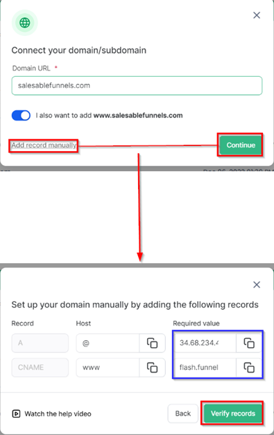 e. In the popup (refer to image below), add your domain URL and hit Continue or Add Record Manually. Click on Verify records.