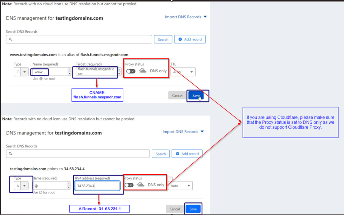 NOTE: Ensure you have an A record pointing to 34.68.234.4 or a CNAME record pointing to flash.funnels.msgsndr.com for in domain within the (). (This would have been completed in Step 1 above.)