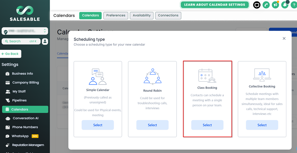 Class Calendars are designed to manage one-to-many events where multiple invitees can attend a single booking. These calendars are ideal for webinars, workshops, training sessions, and sports events. In a Class Calendar, there can only be one appointment owner, typically the trainer or host. The number of spots per slot can be set, with a maximum limit of 9,999 attendees, though meeting location limitations do apply.