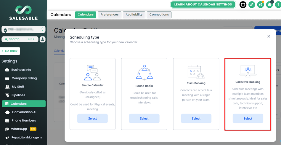 Collective Booking is a feature that enables scheduling meetings involving multiple team members simultaneously. It integrates individual team members' availability into a shared calendar, allowing for unified scheduling. This feature facilitates seamless group interactions, perfect for collaborative endeavors like sales calls, technical support, or group interviews.