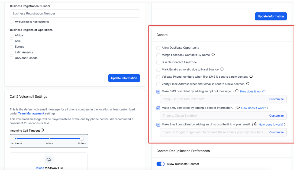 This section of your Business Profile is incredibly important so we will break down each section one by one below. Make sure you pay close attention to these settings as they can have significant effects on your sub-account. You may experience something in the CONTACTS section, not know how to fix it, and then come look at these settings and realize you turned on or turned off something that should or shouldn't have been.