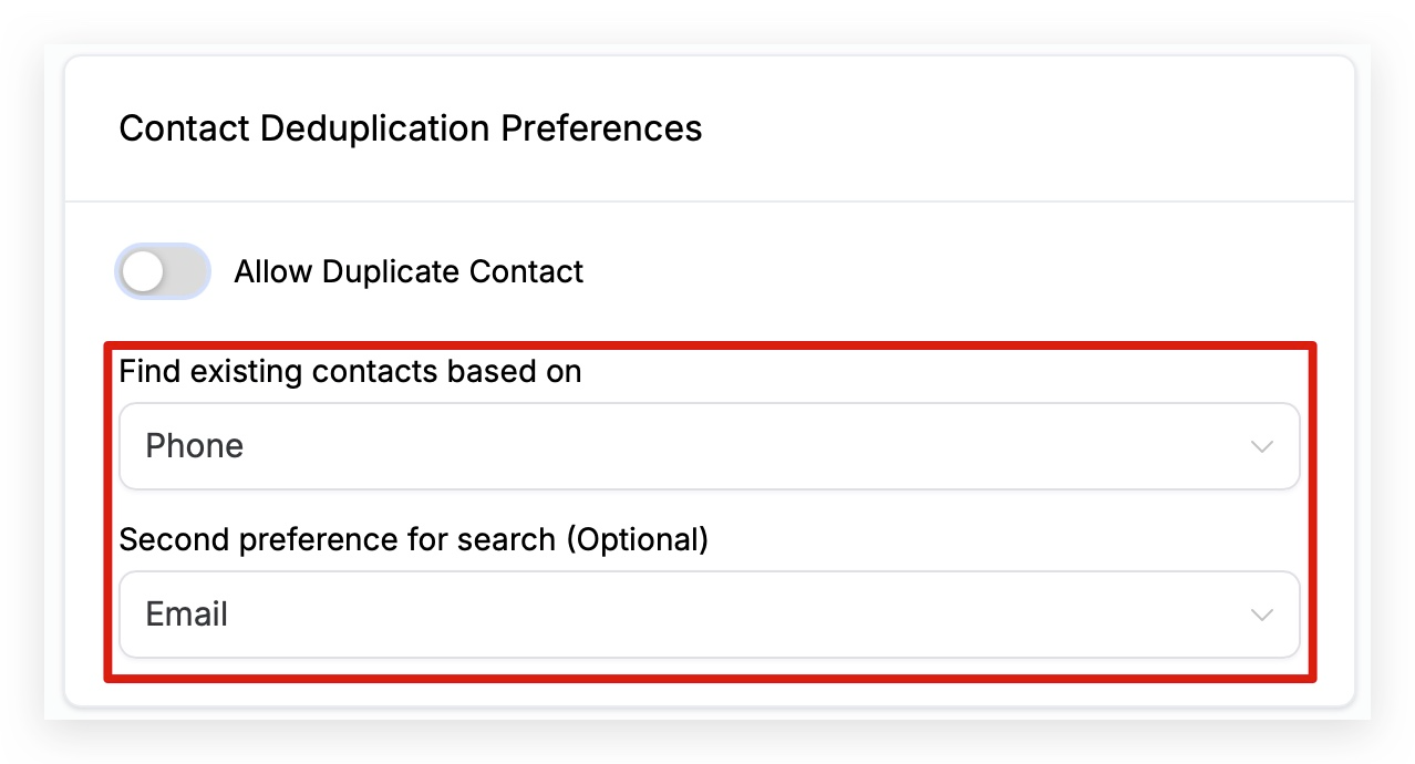 If you choose to toggle this setting OFF, you will be presented with options to adjust exactly how your Salesable sub-account looks for duplicate contacts. You can look for EMAIL or PHONE numbers first when determining if a contact is a duplicate, and if you want another layer of confirmation, you can also select a secondary determining factor.