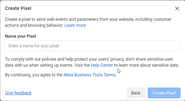 - If you already have pixels, it will ask you to choose between them or create a new pixel. Click on Create new Pixel or Use an existing pixel from the list for collecting the data. Click Continuewhen the pixel details are added.