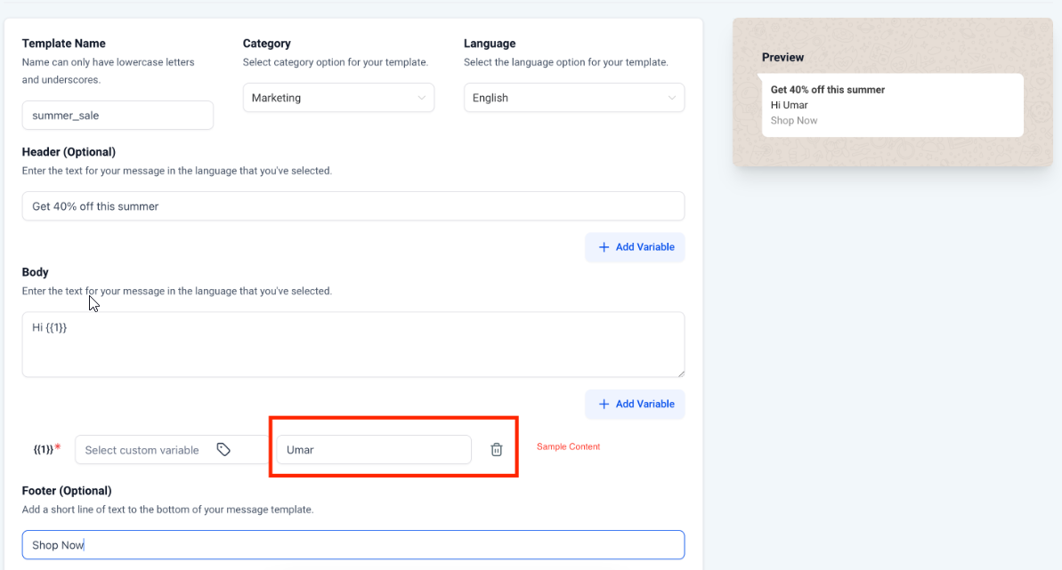 When submitting templates, it's crucial to include sample variable values to visualize how the template will appear to customers. Samples can be added during template creation