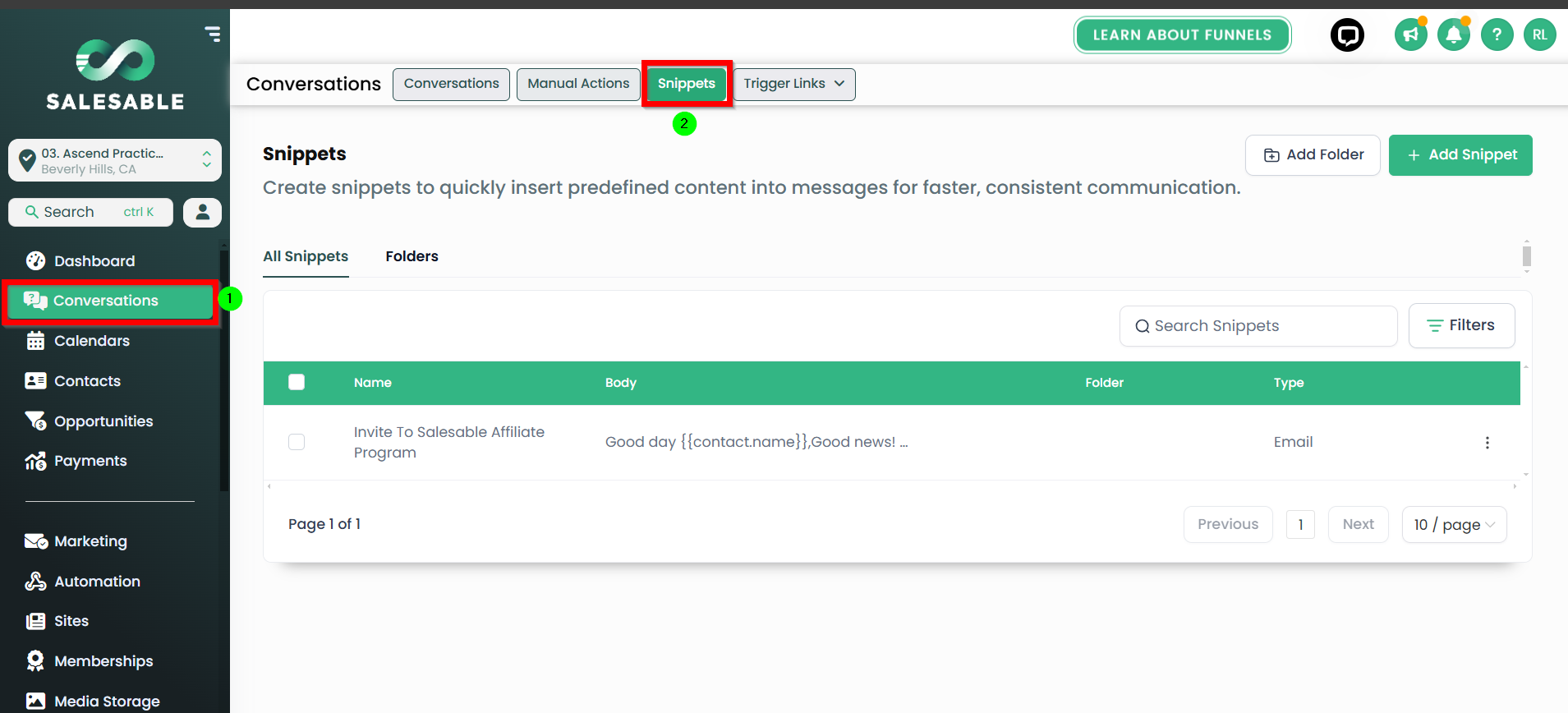 - Navigate to Conversations on the left-hand menu. Select Snippets at the top of the screen.